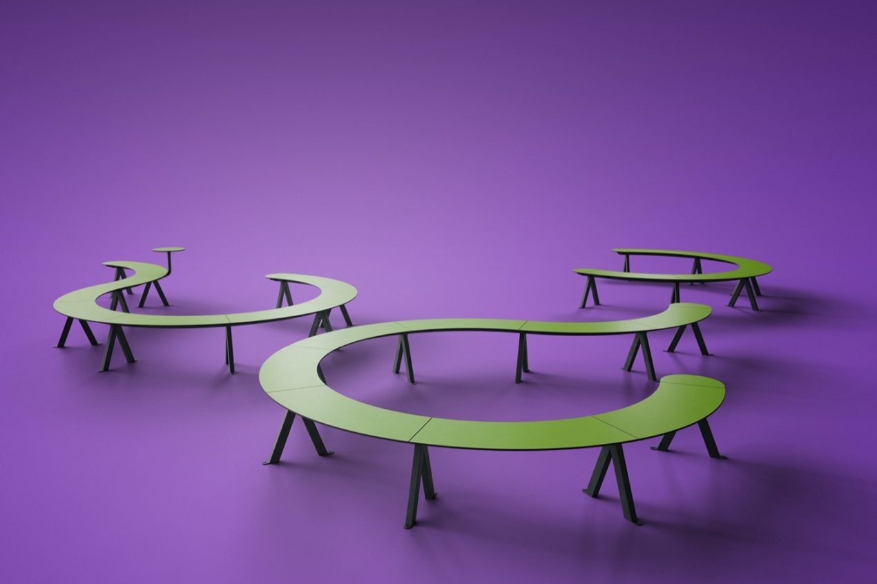 Merlin´s modular elements string together just like a necklace of pearls. The single parts consist of straight and curvy HPL plates, which are mounted onto v-shaped steel legs. Little, round tables are optionally available. These modular parts can be lined up in various shapes: circular around a tree, meandering through a schoolyard or simply as a straight line along the wayside. Like this, a countless number of bench types that vary in length and form can be created. You can play around with the Merlin-Configurator on our website and choose from a whole number of variations. The consciously simple designed bench can easily be integrated into modern as much as historical surroundings. Depending on the color it can either blend in or stand out.