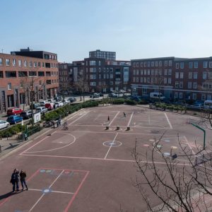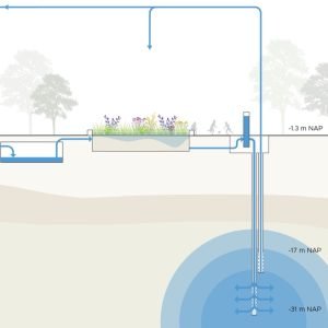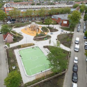 An innovative Urban Water Buffer—Rotterdam’s first in a residential area—was installed beneath the sports field. It stores 475 m³ of rainwater 31 metres underground, which can be used during dry spells for irrigation and the water play feature. The park’s sloped green edges function as infiltration zones and support biodiversity—making Driehoekspark both a pleasant public space and a climate-resilient buffer.