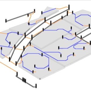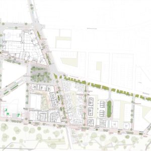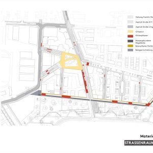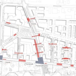 Intarsia adds visual and functional rhythm to the street space. A special paving pattern with clinker bricks uses materiality and color changes to signal special places in the neighborhood. They combine traffic management and slowing with recreational areas, e.g., pedestrian crossings, bicycle parking spaces, and greenery elements. In the area of ground-floor uses, such as restaurants and shops, the inlays also mark and integrate recreational areas with functions such as bicycle parking spaces and street greening for climate adaptation and ecological enhancement of the street space. The remaining paved areas are constructed using a multi-stone system, Kronimus paving, in different formats and varying widths, and support the spatial image of the promenade. The north-south banding was already included in the master plan.