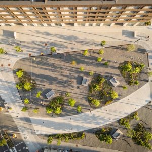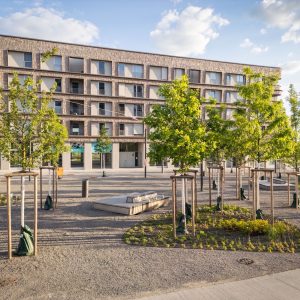 The rows of trees and avenues of the adjacent streets converge to form a mixed, urban forest that promotes health, urban ecology, and cultural quality of life. The existing tree species are supplemented by climate-resilient species such as tulip trees, bladder ash, hop hornbeam, and flowering ash. Despite the greenery, the square remains a paved space with a variety of uses. The pavement design echoes the materiality of the former barracks use. The bus lane consists of in-situ concrete, while the varied paving around the square consists of large trapezoidal concrete slabs.