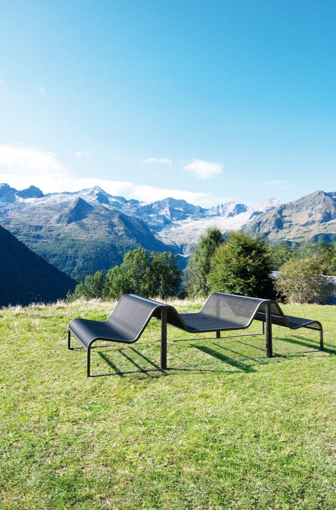 Each element is crafted in curved, rounded steel, offering not only visual softness but also ergonomic comfort. Whether seated or reclined, the furniture supports a relaxed experience, turning every pause into a moment of escape.