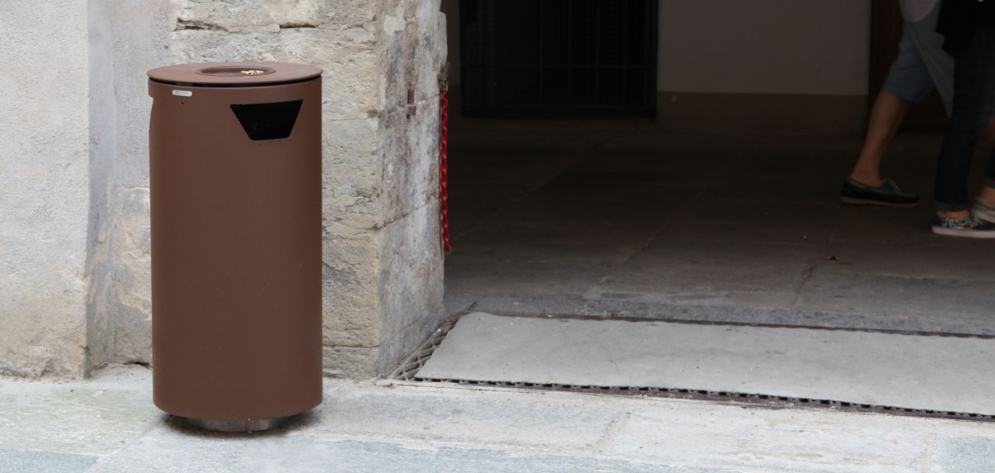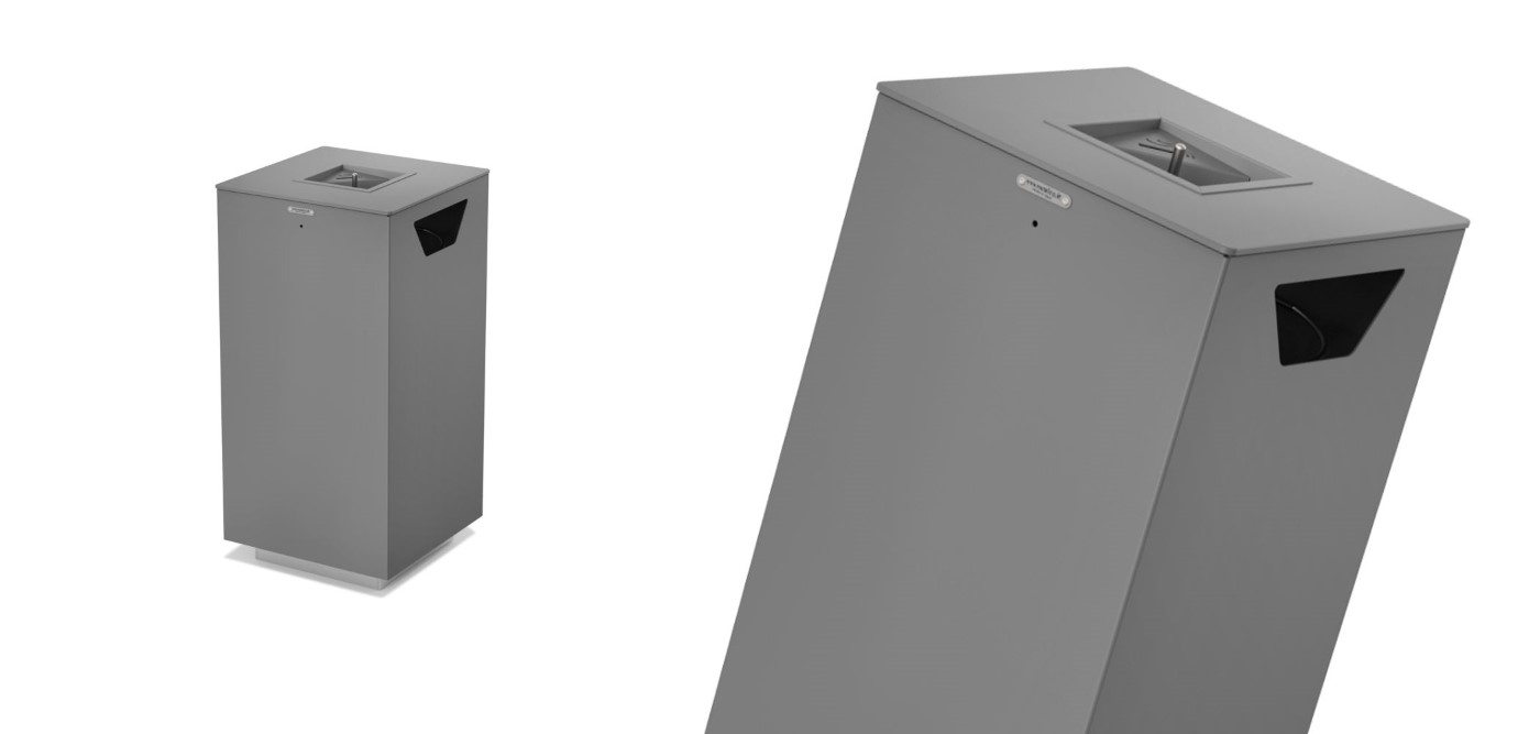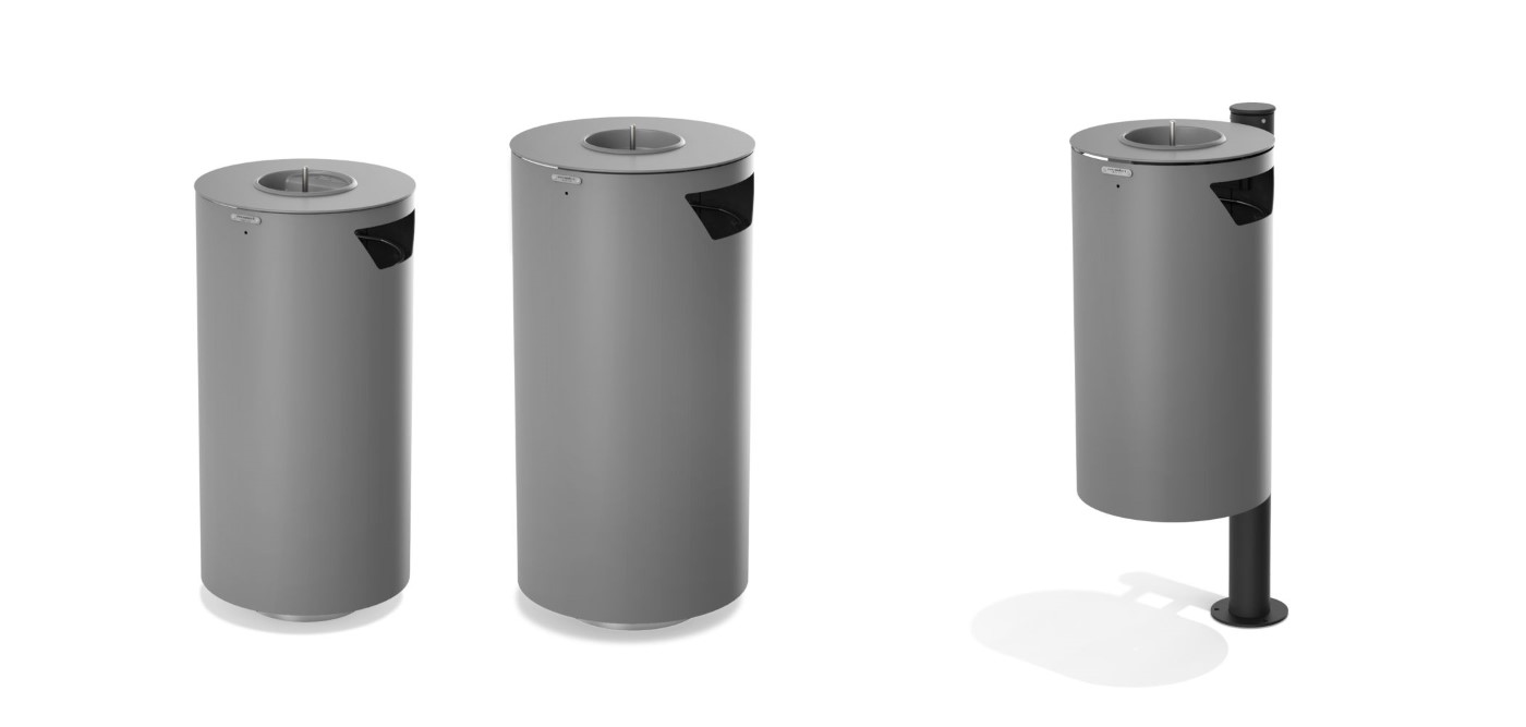Litter bin in steel sheet equipped with a central hole to house the ashtray. The outer structure is equipped with two opposing holes to insert the waste. The openable cover is equipped with Metalco patented lock. Available in a cylindrical or square shape, or to be fastened to an existing pole.