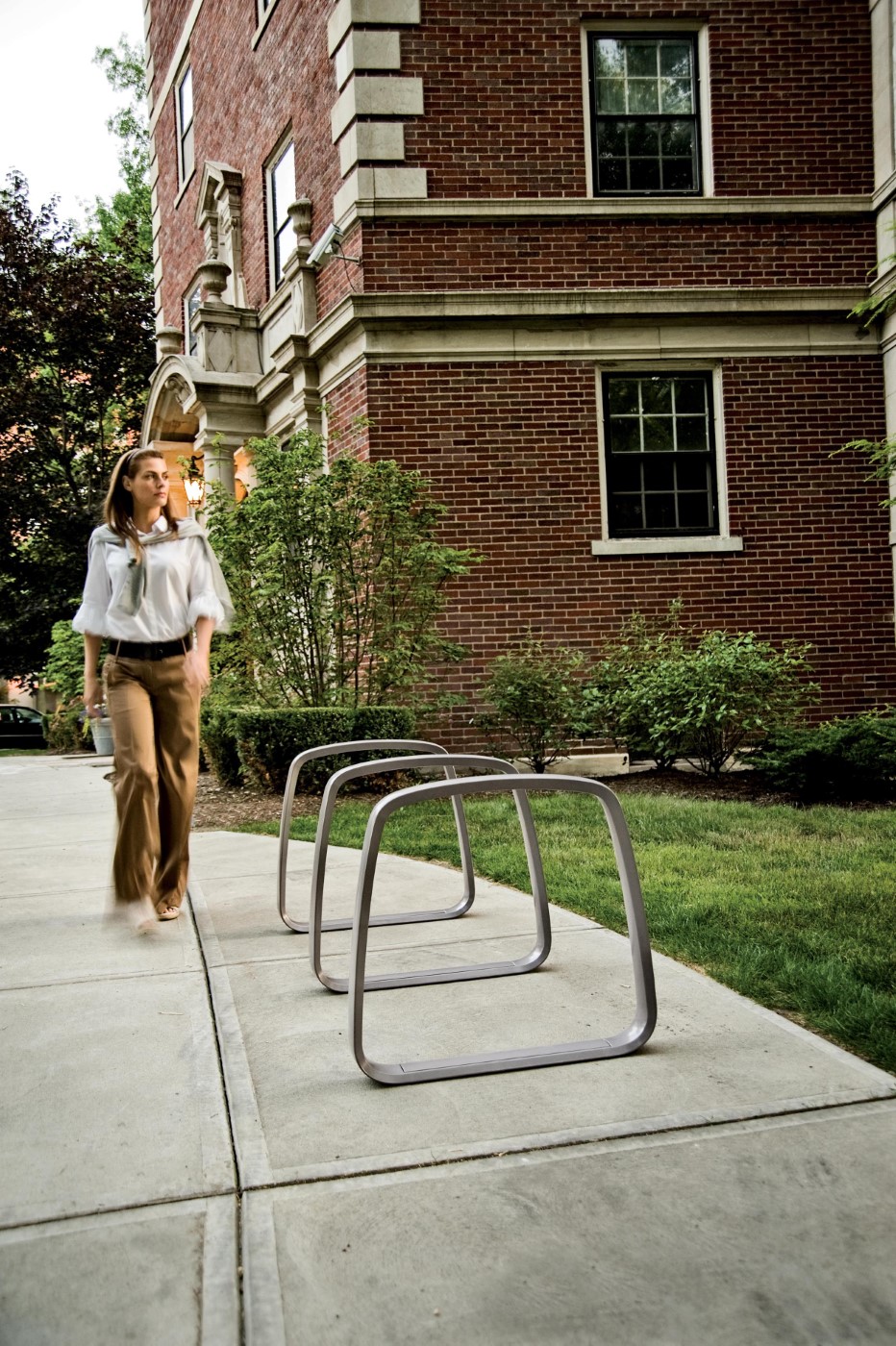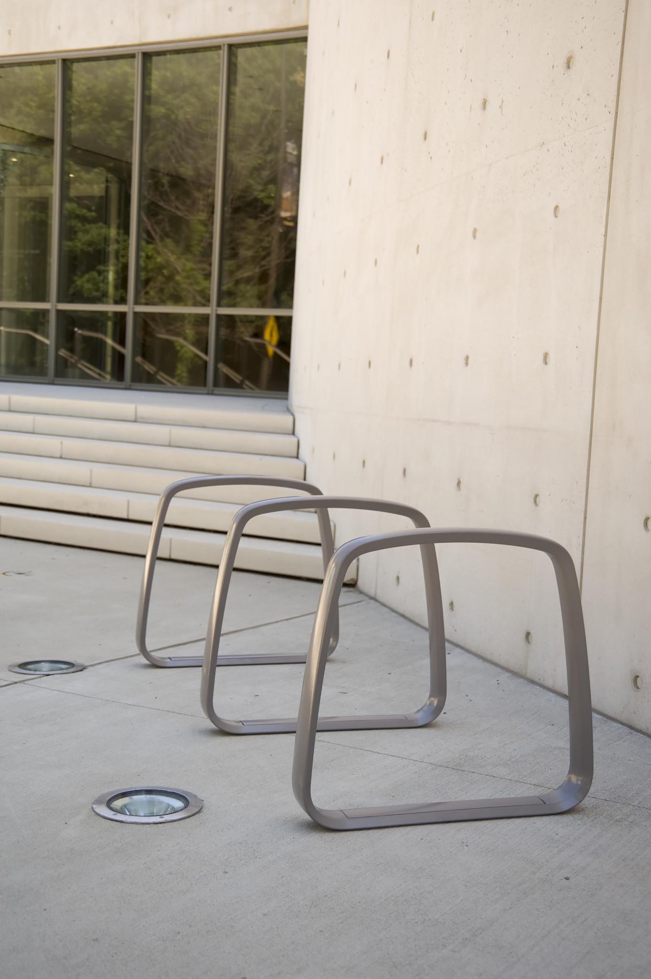 The Metro40 Collection is a pioneering line of urban streetscape and transit elements with sophistication and global appeal for a world on the move. Ride has a cast aluminum flat ribbon frame that is beveled at the edges and tapered from bottom to top. Invisible connections make the looped form appear magically balanced. It provides bicycle support with capability for attachment at two points, on the frame and tires. Ride accommodates a variety of commonly used locks including the standard horseshoe type. It is powdercoat finished to coordinate with other Metro40 elements.