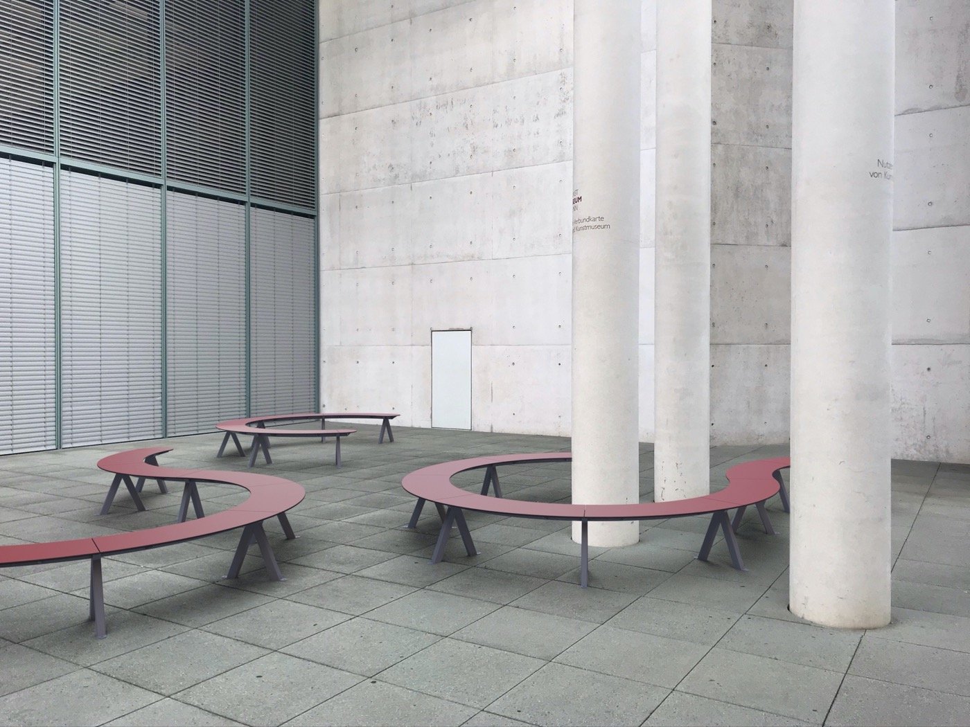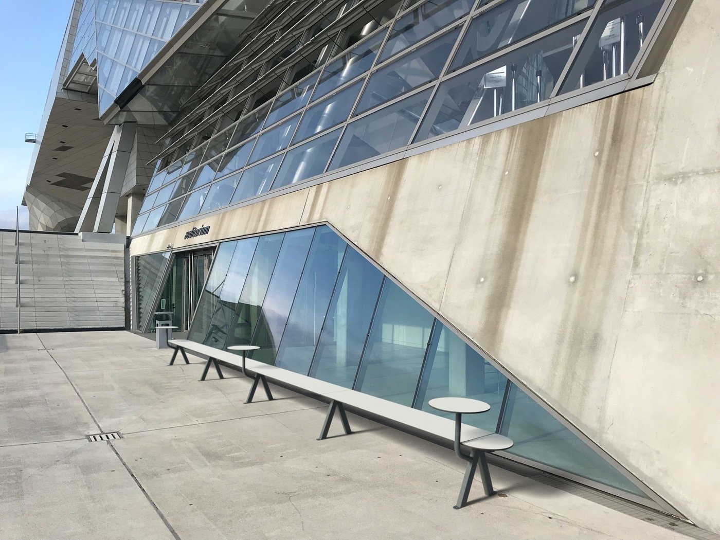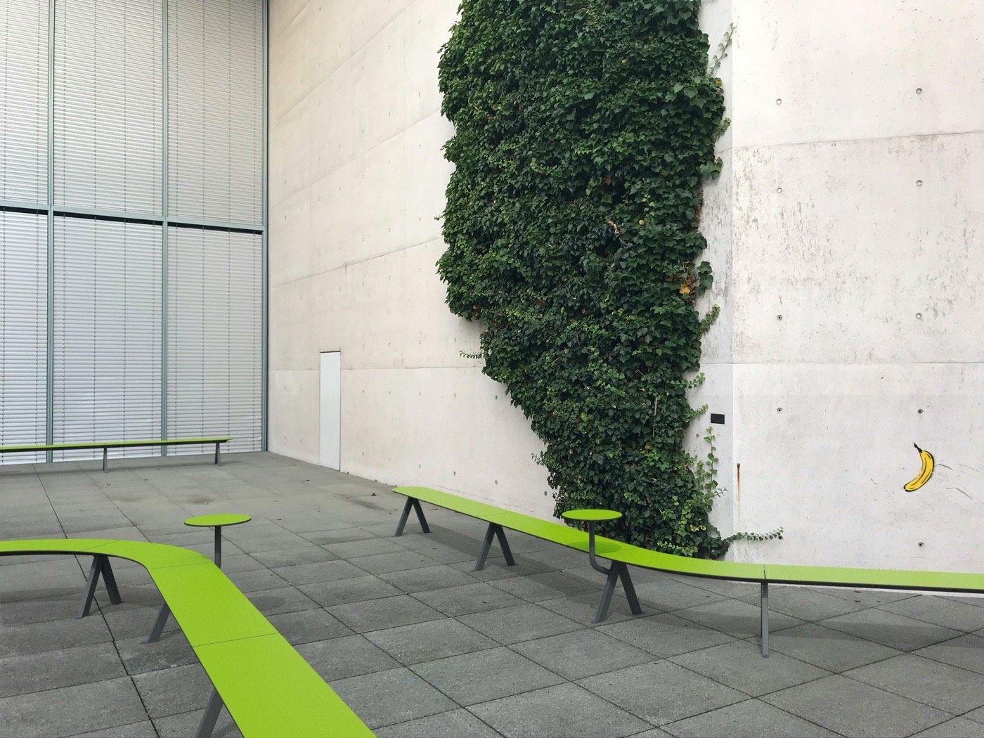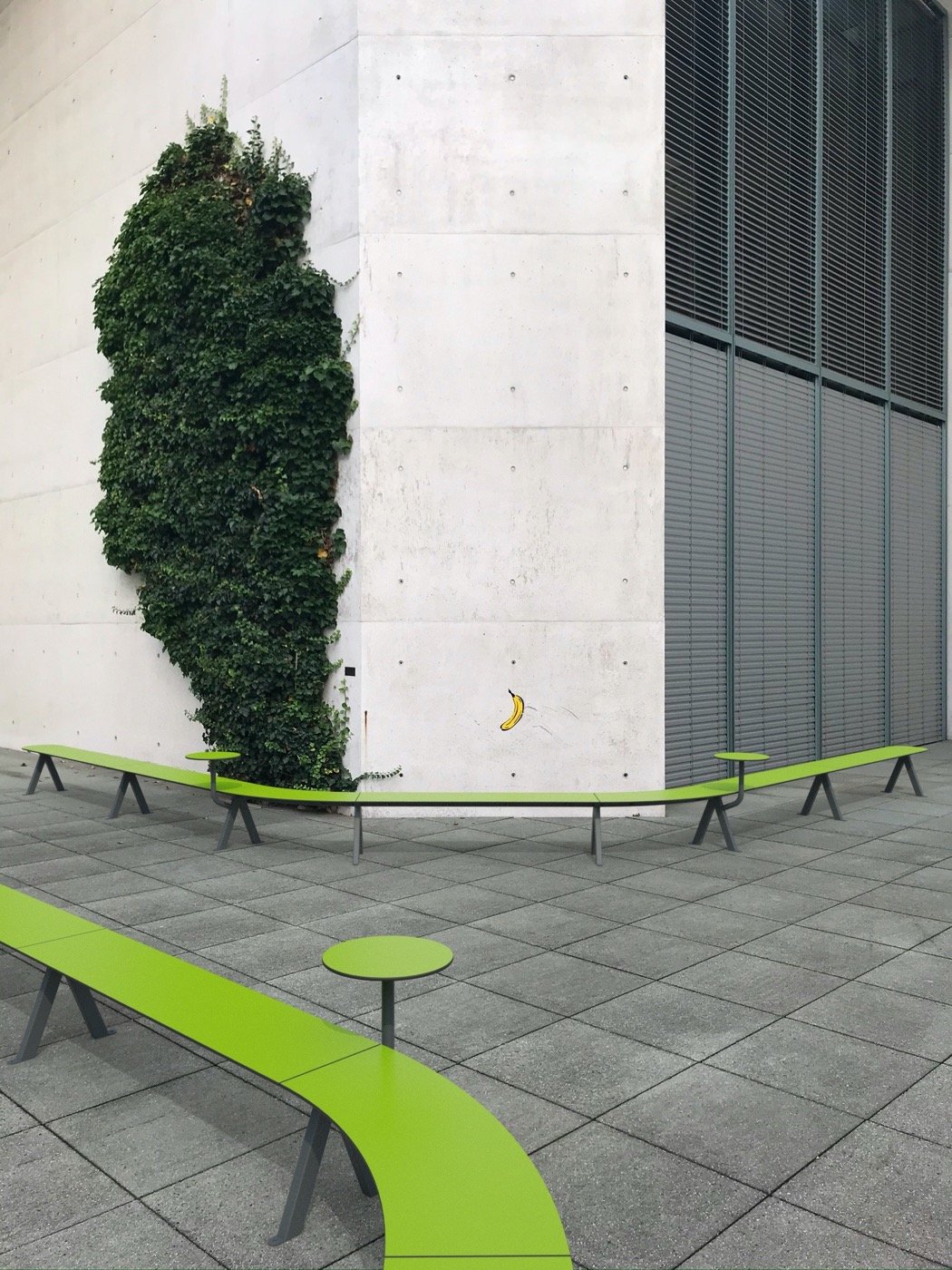 Merlin´s modular elements string together just like a necklace of pearls. The single parts consist of straight and curvy HPL plates, which are mounted onto v-shaped steel legs. Little, round tables are optionally available. These modular parts can be lined up in various shapes: circular around a tree, meandering through a schoolyard or simply as a straight line along the wayside. Like this, a countless number of bench types that vary in length and form can be created. You can play around with the Merlin-Configurator on our website and choose from a whole number of variations. The consciously simple designed bench can easily be integrated into modern as much as historical surroundings. Depending on the color it can either blend in or stand out.