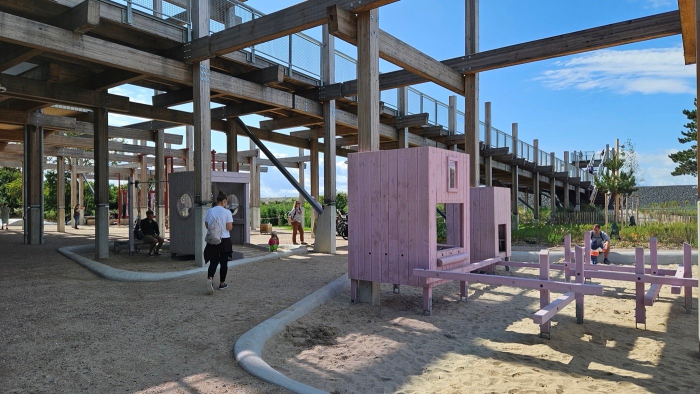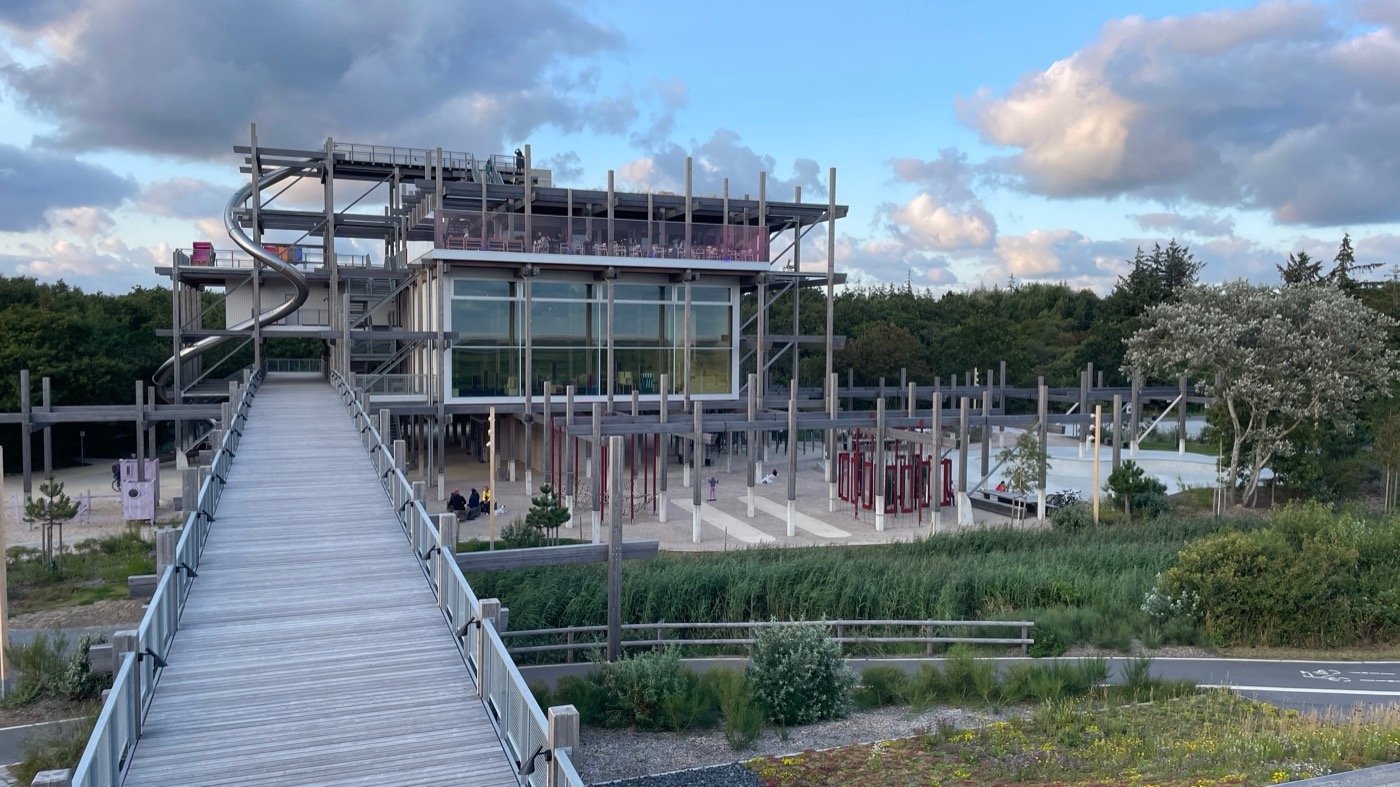 Small installations, seating areas, and play and recreation facilities invite visitors to explore and learn. A footbridge with platforms is carefully integrated into the existing natural biotope, allowing visitors to gain a closer insight into the vegetation structures. Individual viewing platforms and installations are provided at the approaches to the dike to allow sweeping views across the open salt marshes. The spectacular end point of the new section of the Sankt Peter-Ording promenade is a large playhouse, the Erlebnis-Hus, built in timber construction, which with its stilts refers to the traditional beach house typology. In the area of the semi-transparent building, a diverse open space has been created with a mix of sports and play facilities, which are integrated into the orthogonal stilt system and use it as a suspension and static connection.