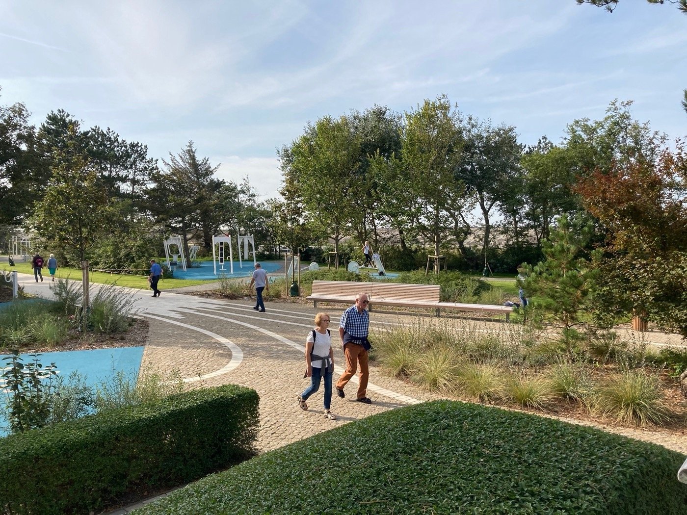 The second phase of construction of the promenade in Sankt Peter-Ording takes up the theme of “fitness and experiencing nature.” We drew inspiration from the genius loci for the shapes and color selection of the green corridor. In addition to the main paths, the existing trails and watercourses in the salt marshes form the access system along the promenade. The result is a sequence of density and expanse, of open meadows and wooded areas with intensive and extensive uses. Themes related to sports and fitness for young and old are integrated along the paths or take place on the meadows. The existing vegetation is largely preserved and developed in specific areas.