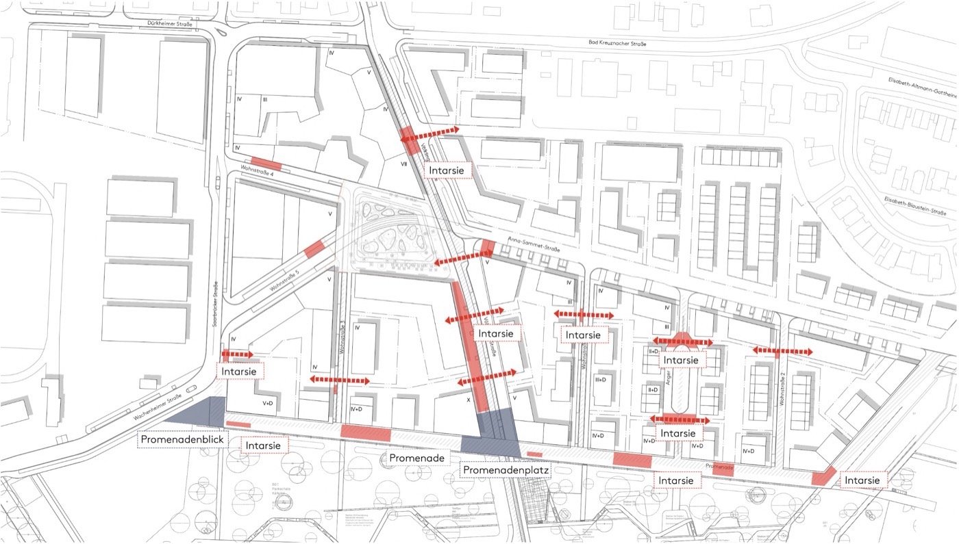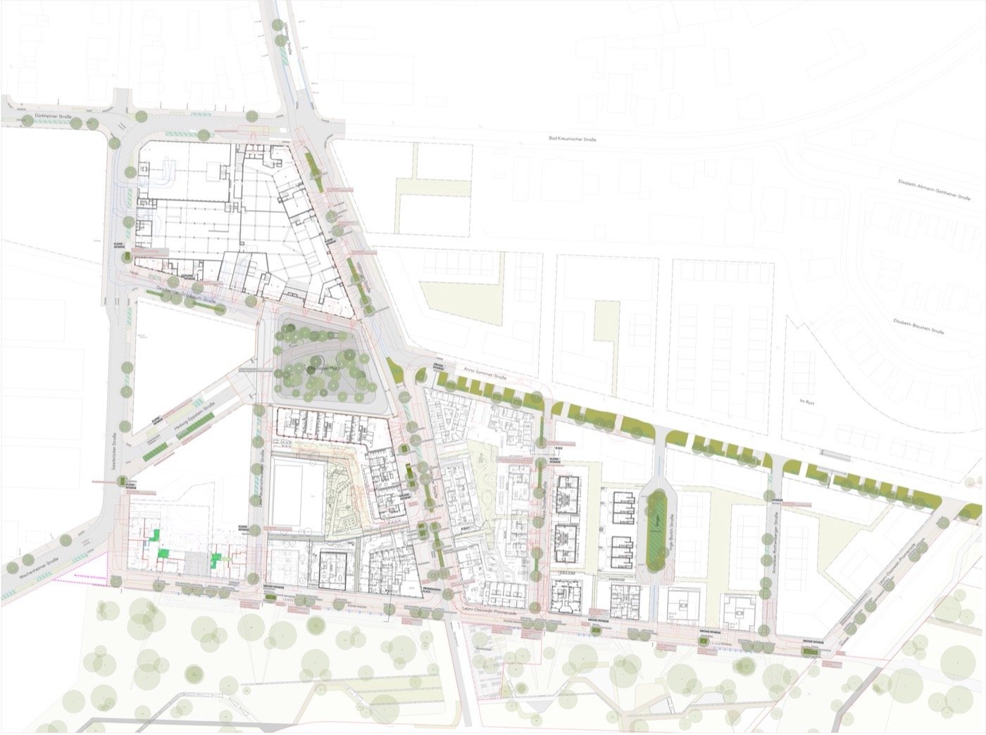 The neighborhood square is located at the intersection of the three main axes – Wachenheimer Straße, Anna-Sammet-Straße, and Völklinger Straße – and forms the green, cooling center of the new urban Spinelli neighborhood. Centrally located, the square connects the Spinelli neighborhood in the north with the BUGA grounds in the south via high-quality street spaces. A bus lane is integrated into the design and can be converted into a tram line in the future.