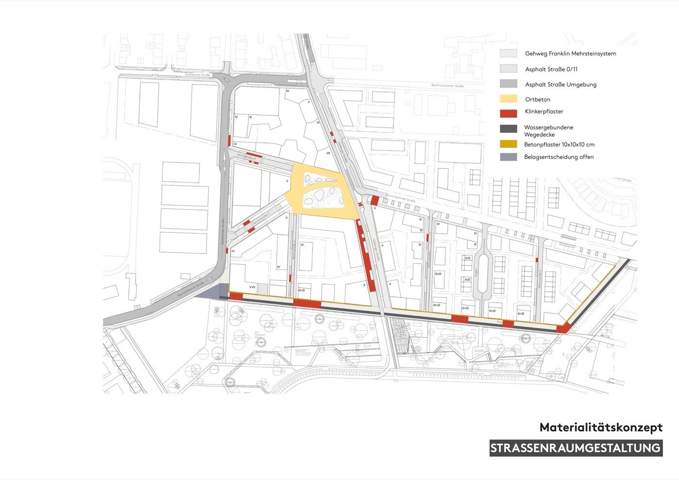 Intarsia adds visual and functional rhythm to the street space. A special paving pattern with clinker bricks uses materiality and color changes to signal special places in the neighborhood. They combine traffic management and slowing with recreational areas, e.g., pedestrian crossings, bicycle parking spaces, and greenery elements. In the area of ground-floor uses, such as restaurants and shops, the inlays also mark and integrate recreational areas with functions such as bicycle parking spaces and street greening for climate adaptation and ecological enhancement of the street space. The remaining paved areas are constructed using a multi-stone system, Kronimus paving, in different formats and varying widths, and support the spatial image of the promenade. The north-south banding was already included in the master plan.