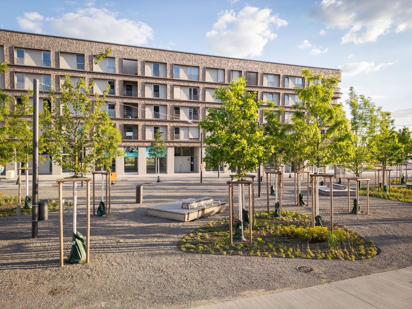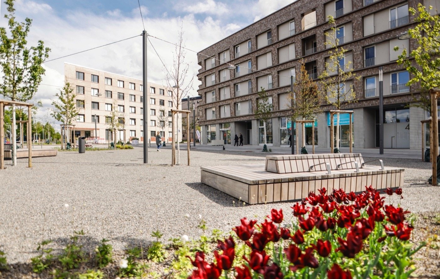 The rows of trees and avenues of the adjacent streets converge to form a mixed, urban forest that promotes health, urban ecology, and cultural quality of life. The existing tree species are supplemented by climate-resilient species such as tulip trees, bladder ash, hop hornbeam, and flowering ash. Despite the greenery, the square remains a paved space with a variety of uses. The pavement design echoes the materiality of the former barracks use. The bus lane consists of in-situ concrete, while the varied paving around the square consists of large trapezoidal concrete slabs.