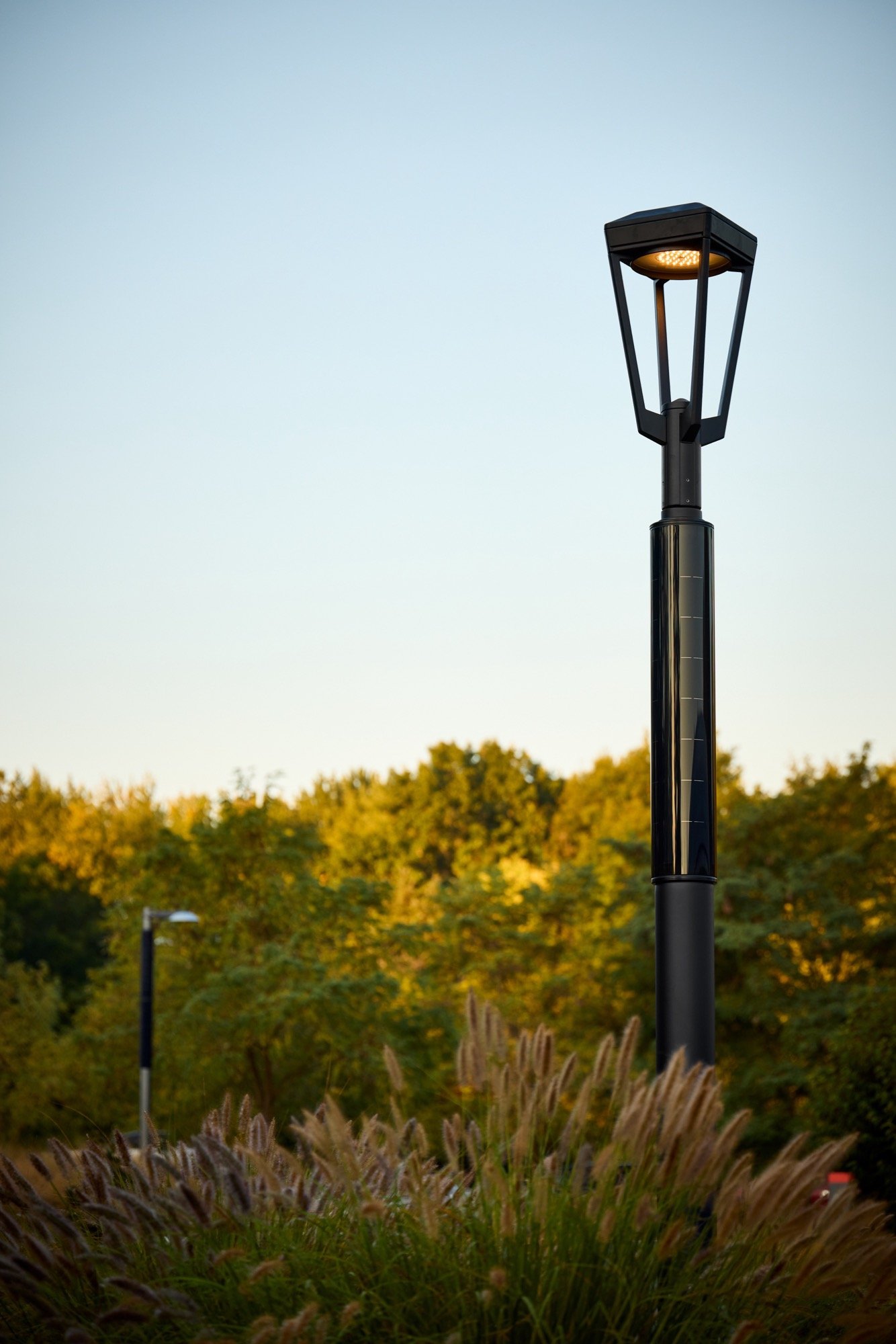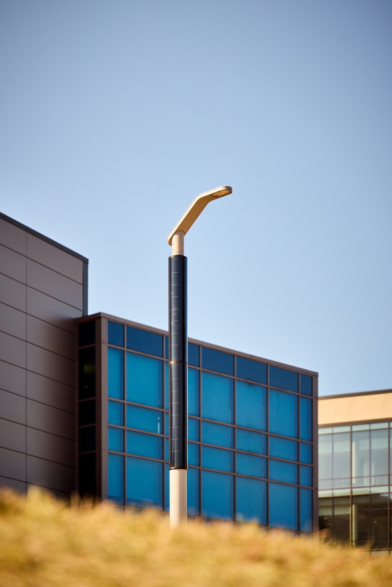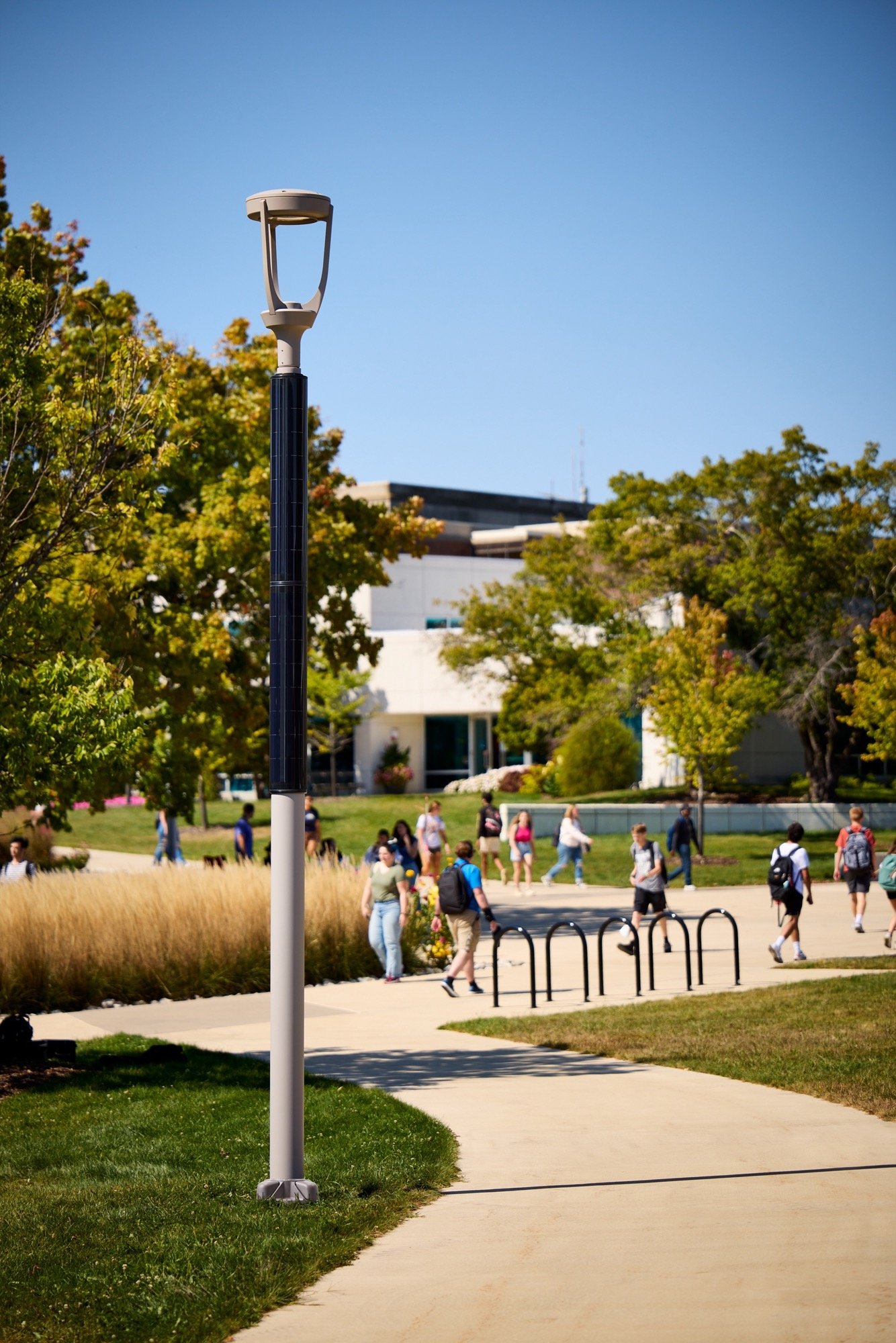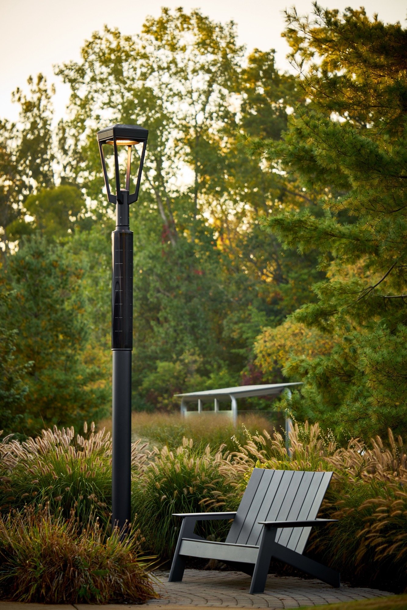 Developed in collaboration between Michigan-based lighting and site furnishing manufacturer Landscape Forms and Netherlands-based FlexSol Lighting Solutions, 360 Solar marks substantive innovation in both form and function. Its most striking feature—the cylindrical solar array—is a distinct departure from conventional flat panels. Solar cells are embedded directly into a tempered glass sleeve that wraps vertically around the luminaire pole, enabling energy capture from multiple angles throughout the day. This vertical orientation also resists dust, snow, wind and other environmental challenges that often limit performance. The result is a solar lighting system that’s not just more resilient and more performant, but also more elegant.