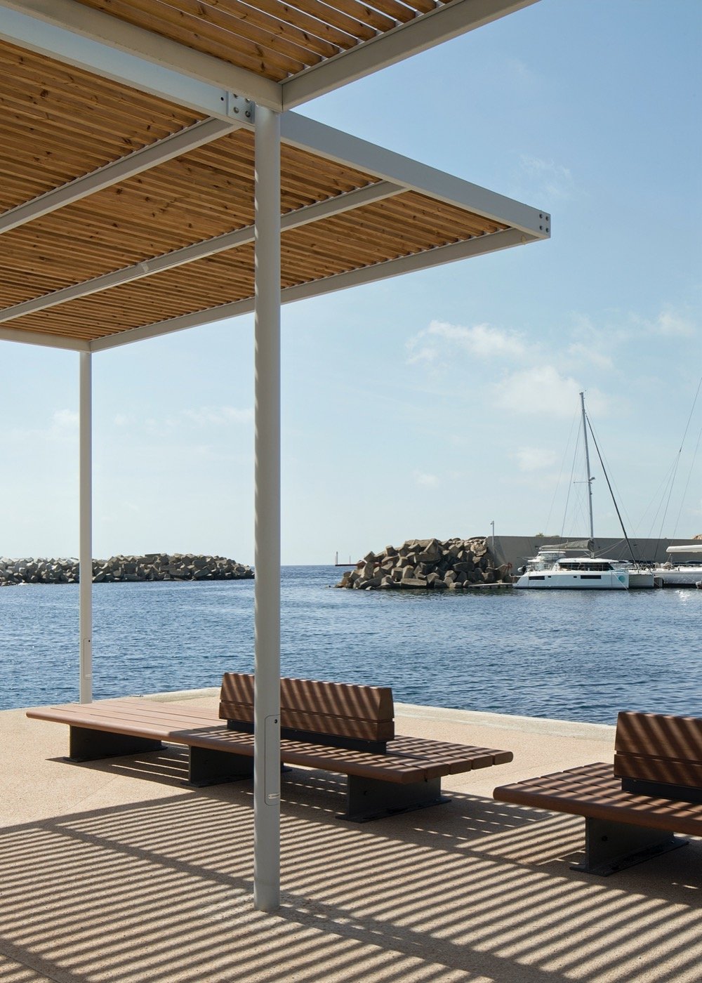The incorporation of two groups of Comunitario benches enriches the squares and encourages conversation. As its name suggests, this very large urban seat sets the location apart, with a presence that is a social draw. The Nu and Comunitario urban platforms decorate the nautical scene, together with a set of large planters. With two levels, they house a lush double layer of plants: bushes and trees, including species such as Tamarix africana and Westringea fructicosa. Selected on an ad hoc basis for their qualities and their excellent resistance in seaside environments.
