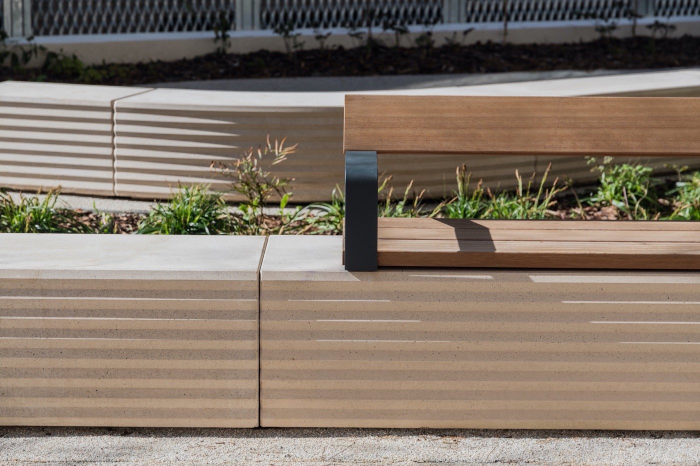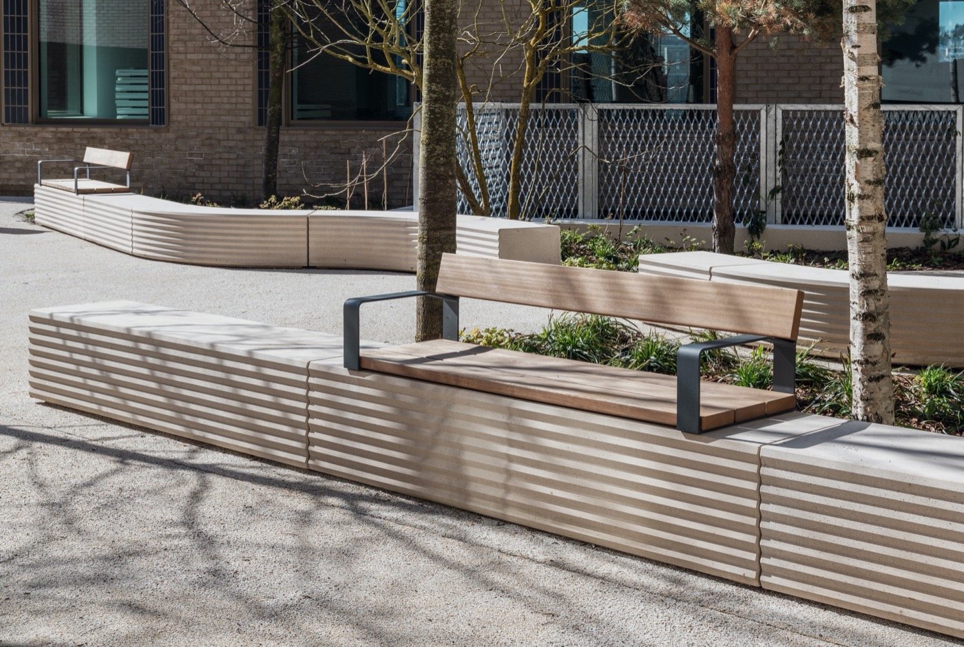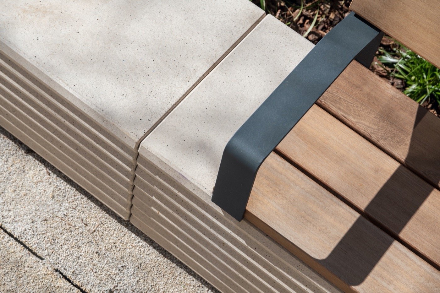 To furnish these spaces, the project incorporates Strat modular benches, a design solution that harmonises with the cultural and architectural identity of Brighton. Strat reflects the city’s historical character while introducing a contemporary aesthetic through its materiality and form. The benches combine warm beige-toned architectural concrete with tropical wood seating surfaces, striking a balance between durability, comfort, and visual warmth.