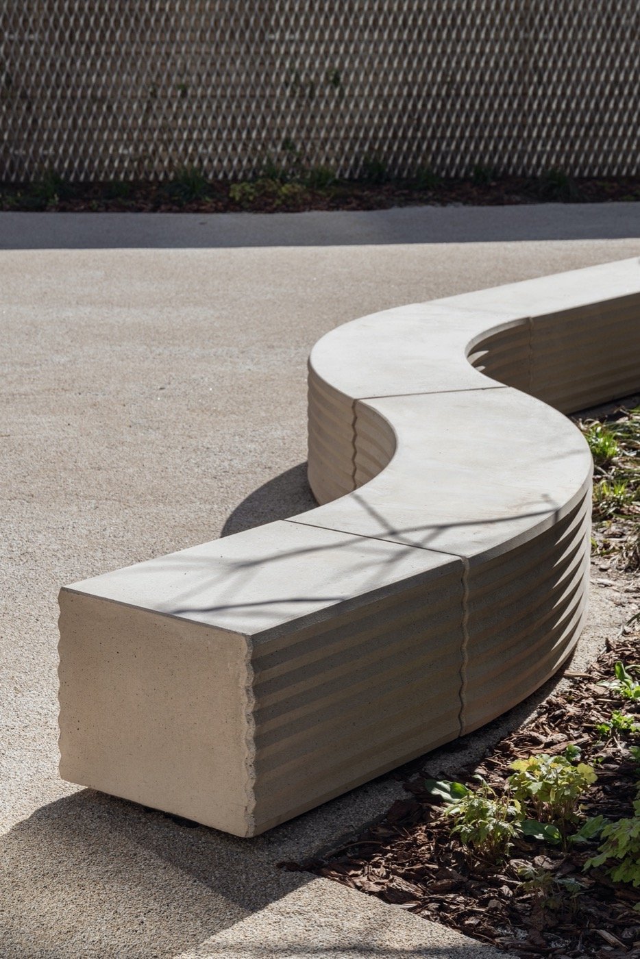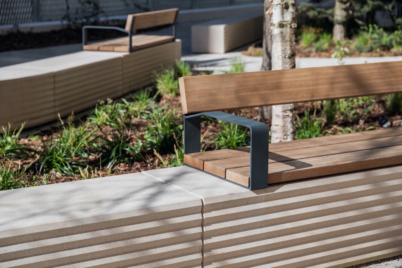 Crafted from moulded concrete, Strat benches emphasise the sculptural qualities of the material, resulting in a robust yet refined presence. Some models can be enhanced with certified tropical wood seats and armrests, offering an added layer of comfort and tactile warmth for users.