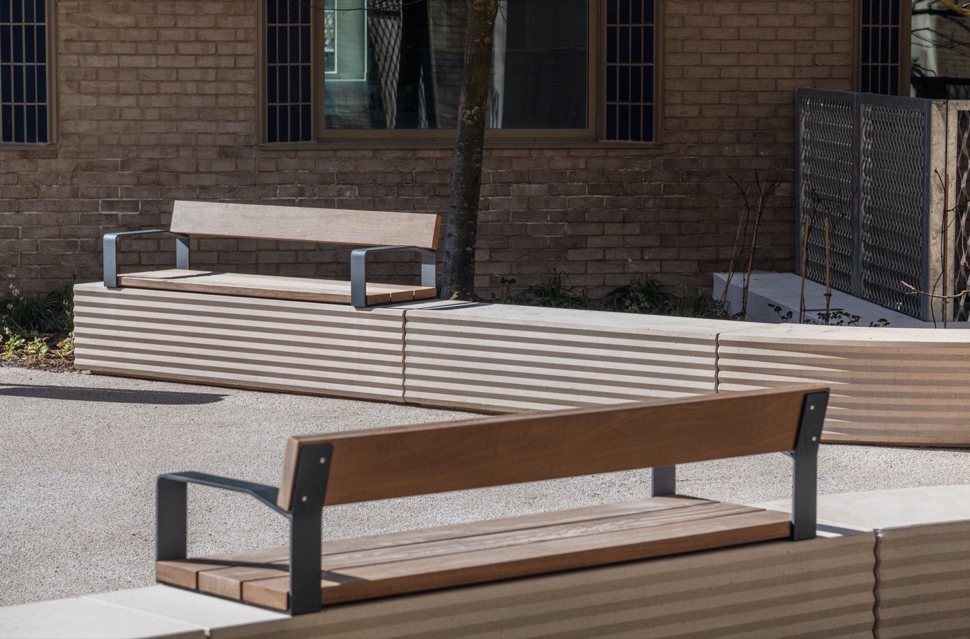 The Strat collection is defined by its versatility and strong architectural presence. Its modular system allows for varied compositions, adapting to different urban contexts while maintaining a consistent design language. The zigzag faceted front of the benches introduces a dynamic visual rhythm, creating subtle plays of light and shadow that animate the surrounding space throughout the day.